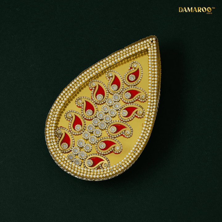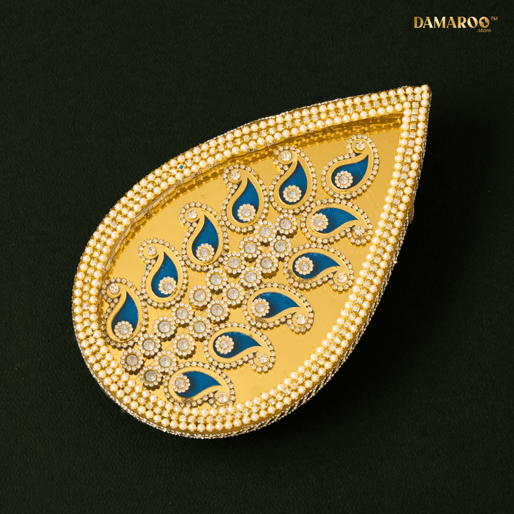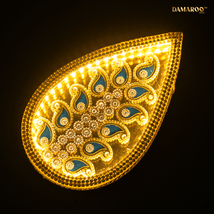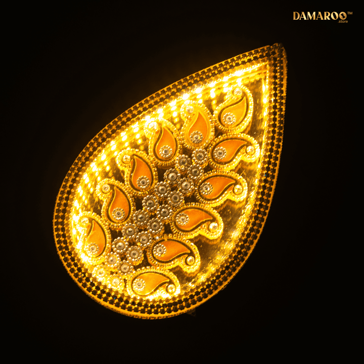 A premium paisley (kairi) rangoli crafted on golden acrylic for that extra glow. Each piece is hand-adorned with kundan kairi motifs and button stones, finished with pearl borders. By day the kairis shimmer; by night the warm Warm White LED halo turns the setup temple-serene. Cordless & portable - every piece runs on a 9V battery with a neat On/Off switch beneath. Arrives in a premium transparent PVC container for gifting and safe storage.