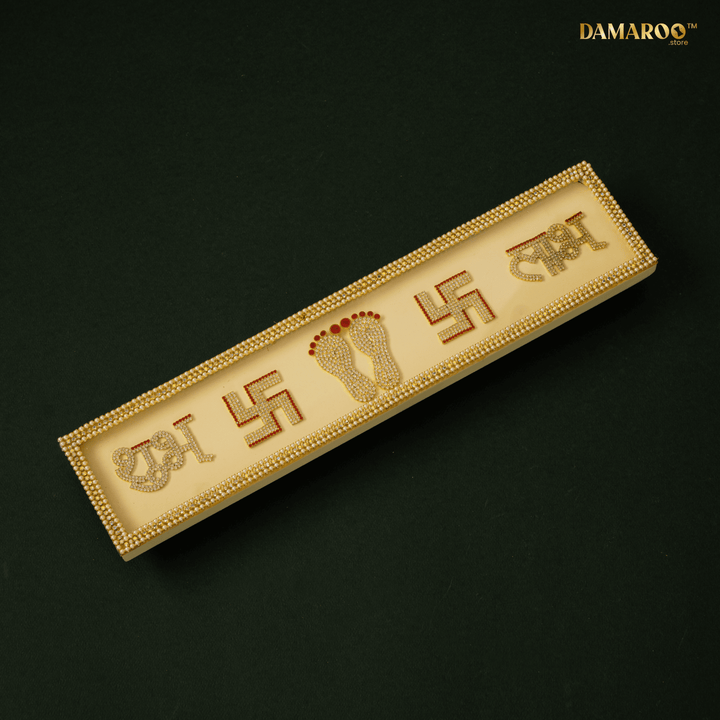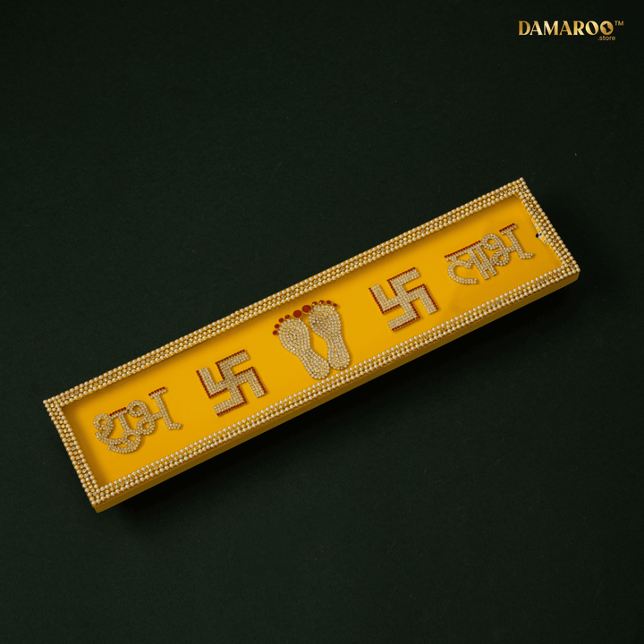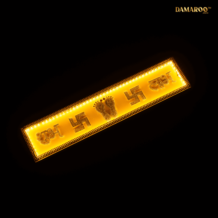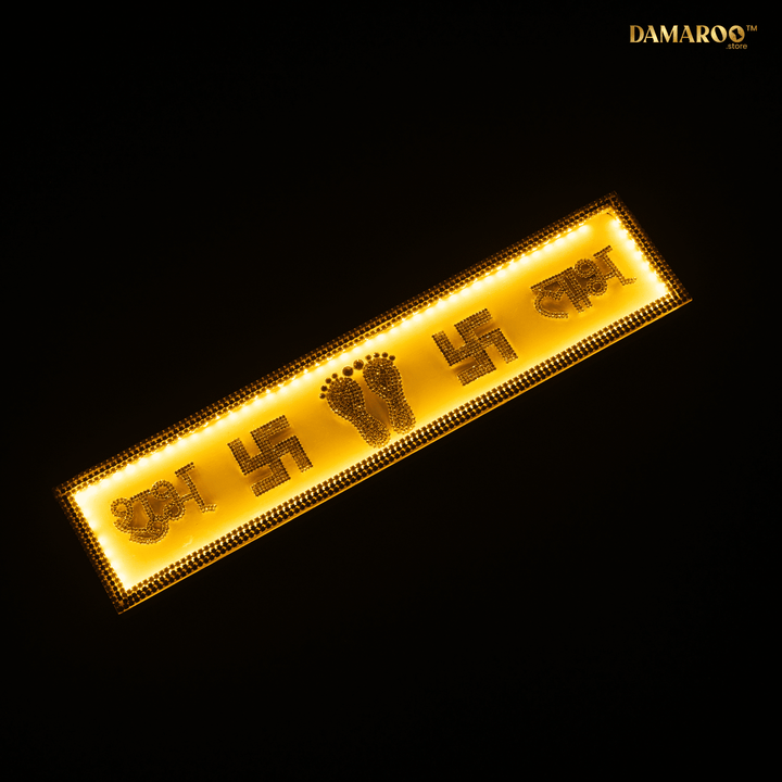 A stone-studded Shubh–Labh • Swastik • Lakshmi Charan LED strip on MDF with elegant legs—made for table-top use (not for hanging). The warm halo looks divine even when unlit, making it perfect beside a rangoli, at the doorway/entrance, mandir, console table, or any festive vignette.